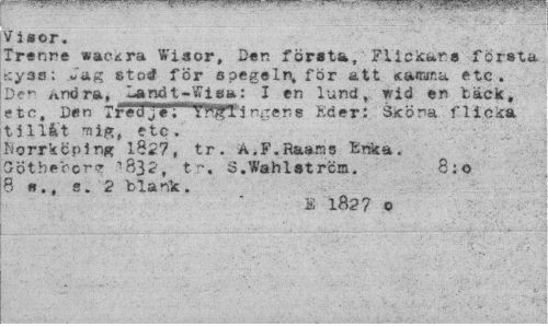//// tfisor. //// Trtnrte »ac&ra Wisor, Den första,• Flickar» första r:y3a; Jag sto<J för spegeln, för att «camina. etc. Den >tndra, Landt-Wiea: I en lund, wid en täck, etc. Den Tredjé"l"mf*%"tirtgens Eder: Skona flicka tillåt mi«, etc. //// Korrkcpin^ 1827, tr. A.F.R&aras "£nka. OÖthecor? tr, 3,Wahlström, 8:0 //// 8 «., s. 2 blank. //// 1 182? o ////