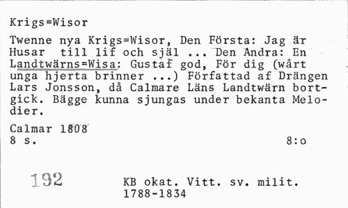 //// Krigs=Wisor //// Twenne nya Krigs=Wisor, Den Första: Jag är Husar till lif och själ ... Den Andra: En Landtwärns=Wisa: Gustaf god, För dig (wårt unga hjerta brinner ...) Författad af Drängen Lars Jonsson, då Calmare Läns Landtwärn bortgick. Bägge kunna sjungas under bekanta Melodier. //// Calmar 1808 //// 8 s. 8:0 //// IQ© KB okat. Vitt. sv. milit. //// v 1788-1834 ////