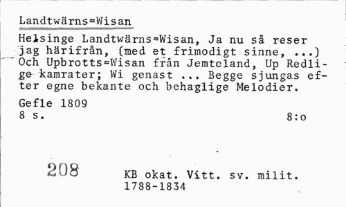 //// Landtwärns =Wis an //// Helsinge Landtwärns=Wisan, Ja nu så reser jag härifrån, (med et frimodigt sinne, ...) ..."Och Upbrotts=Wisan från Jemteland, Up Redlige kamrater; Wi genast ... Begge sjungas efter egne bekante och behaglige Melodier. //// Gefle 1809 //// 8 s. 8:0 //// 2f}Q KB okat. Vitt. sv. milit. //// 1788-1834 ////