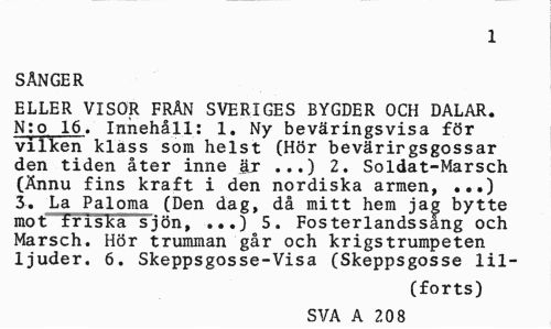 //// 1 //// SÅNGER //// ELLER VISOR FRÄN SVERIGES BYGDER OCH DALAR. N:o 16. Innehåll: 1. Ny beväringsvisa för vilken kläss som helst (Hör bevärirgsgossar den tiden åter inne är ...) 2. Soldat-Marsch (Ännu fins kraft i den nordiska armen, ...) 3. La Paloma (Den dag, då mitt hem jag bytte mot friska sjön, ...) 5. Fosterlandssang och Marsch. Hör trumman går och krigstrumpeten ljuder. 6. Skeppsgosse-Visa (Skeppsgosse lil- //// (forts) //// SVA A 208 ////