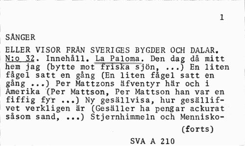 //// 1 //// sånger //// ELLER VISOR FRÄN SVERIGES BYGDER OCH DALAR. N;o 32. Innehåll. La Paloma. Den dag då mitt hem jag (bytte mot friska sjön, ...) En liten fågel satt en gång (En liten fågel satt en gång ...) Per Mattzons äfventyr här och i Amerika (Per Mattson, Per Mattson han var en fiffig fyr ...) Ny gesällvisa, hur gesällif-vet verkligen är (Gesäller ha pengar ackurat såsom sand, ...) Stjernhimmeln och Mennisko- //// (forts) //// SVA A 210 ////
