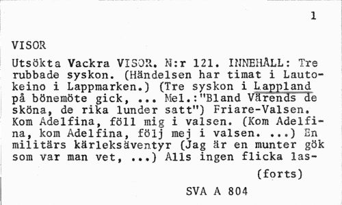 //// 1 //// VISOR //// Utsökta Vackra VISOR. N:r 121. INNEHALL: Tre rubbade syskon. (Händelsen har timat i Lauto-keino i Lappmarken.) (Tre syskon i Lappland på bönemöte gick, ... Mel.:"Bland Värends de sköna, de rika lunder satt") Friare-Valsen. Kom Adelfina, föll mig i valsen. (Kom Adelfina, kom Adel fina, följ mej i valsen. ...) En militärs kärleksäventyr (Jag är en munter gök som var man vet, ...) Alls ingen flicka las- //// (forts) //// SVA A 804 ////