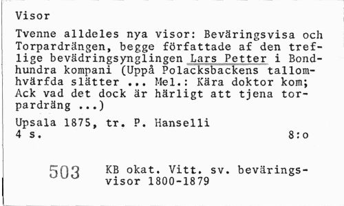 //// Visor //// Tvenne alldeles nya visor: Beväringsvisa och Torpardrängen, begge författade af den tref-lige bevädringsynglingen Lars Petter i Bond-hundra kompani (Uppå Polacksbackens tallom-hvärfda slätter ... Mel.: Kära doktor kom; Ack vad det dock är härligt att tjena tor-pardräng ...) //// Upsala 1875, tr. P. Hanselli 4 s. 8:0 //// ^(IQ KB okat. Vitt. sv. bevärings- //// uo visor 1800-1879 ////