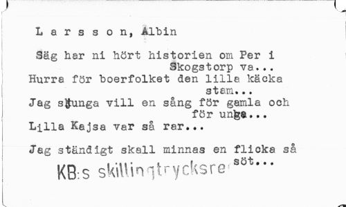 //// Larsson, Albin //// Säg har ni hört historien om Per i //// Skogstorp va... Hurre för boerfolket den lille käcka //// stem... //// Jag sjunga vill en sång för gamla och //// för ungt... Lilla Kajsa var så rar... //// Jeg ständigt skall minnas en flicka så //// KB-.s s killin q tr v eks re söt"* ////
