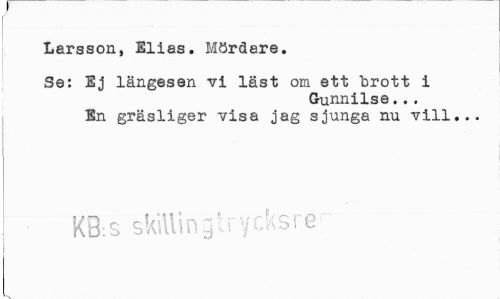 //// Larsson, Elias. Mördare. //// Se: Ej längesen vi läst om ett "brott i //// Gunnilse... //// En gräsliger visa jag sjunga nu vill... //// K8:s skillin gir y eks rer ////