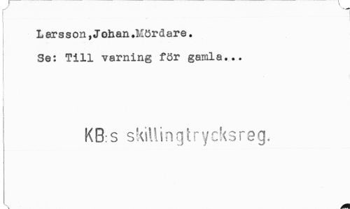 //// Larsson, Johan »Mördare. //// Se: Till varning för gamla... //// KB s skilli n g t r y eks re g. ////