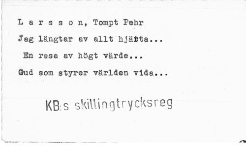 //// Larsson, Tompt Pehr Jag längtar av allt'hjäfcta... //// En resa av högt värde... Gud som styrer världen vida... //// KB.s sk\Ui n g t r y eks reg ////