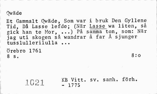 //// Qwäde //// Et Gammalt Qwäde, Som war i bruk Den Gyllene Tid, Då Lasse lefde; (När Lasse wa liten, så gick han te Mor, ...) På samma ton, som: När jag uti skogen så wandrar å far Å sjunger tusslullerilulla ... //// Örebro 1761 //// 8 s. 8:0 //// inni KB Vitt. sv. samh. förh. //// lUrfl - 1775 ////