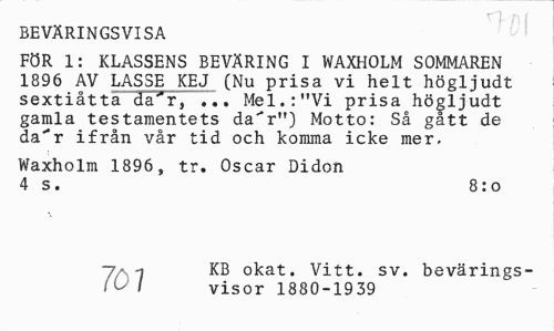 //// ry ni //// BEVÄRINGSVISA //// FÖR 1: KLASSENS BEVÄRING I WAXHOLM SOMMAREN 1896 AV LASSE KEJ (Nu prisa vi helt högljudt sextiåtta da~r, ... Mel.:"Vi prisa högljudt gamla testamentets da"r") Motto: Så gått de da"r ifrån vår tid och komma icke mer, //// Waxholm 1896, tr. Oscar Didon 4 s. 8: o //// 7> -i KB okat. Vitt. sv. bevärings- //// (v I visor 1880-1939 ////