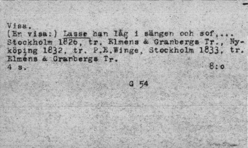 //// V jea. //// (Er. visa:) lasse han Ikq i sängen och sof,,,. Stockholm 1826,"1r. Elmens & Granberg» Tr-, Nyköping 1832, tr. P.E.Sfinge, Stockholm 1833» tr. Elmens 6. Granberg» Tr. //// 4s. 8:0 //// . ¦ a 5* '; ' ////