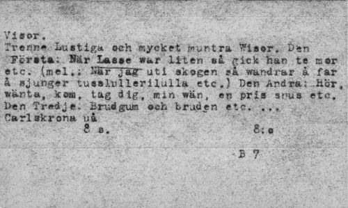 //// Vi»or. //// Trenn* Lustiga och mycket muntra ^fisor. Ben Företa; Bär Laeeewar liten eå. gick han te mor etc. (mel. i N5r™Ja5" uti skogen si wandrar a far å sjunger tusslullerilulla etc.) Den Andra; hor, ¦wärta, kom, tag dig, min wän, en pris snus etc. Den Tredje. Brudgum och bräden etc. ... Carlskrona ua //// t a. //// •b 7-' '0; ////