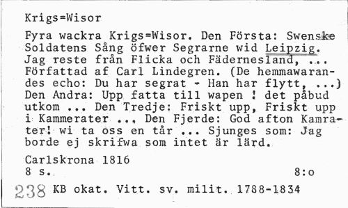 //// Krigs=Wisor //// Fyra wackra Krigs=Wisor. Den Första: SwensJce Soldatens Sång öfwer Segrarne wid Leipzig. Jag reste från Flicka och Fädernesland, ... Författad af Carl Lindegren. (De hemmawaran-des echo: Du har segrat - Han har flytt, ...} Den Andra: Upp fatta till wapen I det påbud utkom ... Den Tredje: Friskt upp, Friskt upp i Kammerater Den Fjerde: God afton Kamrater! wi ta oss en tår ... Sjunges som: Jag borde ej skrifwa som intet är lärd. //// Carlskrona 1816 //// 8 s.. 8:0 //// 238 KB okat. Vitt. sv. milit. 1788-1834 ////