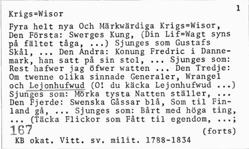 //// Krigs=Wisor 1 //// Fyra helt nya Och Märkwärdiga Krigs=Wisor, Den Första: Swerges Kung, (Din Lif=Wagt syns på fältet tåga, ...) Sjunges som Gustafs Skål, ... Den Andra: Konung Fredric i Dannemark, han satt på sin stol, ... Sjunges som: Rest hafwer jag öfwer watten ... Den Tredje: Om twenne olika sinnade Generaler, Wrangel och Lejonhufwud (O! du käcka Lejonhufwud ...) Sjunges som: Mörka tysta Natten ställer, ... Den Fjerde: Swenska Gåssar blå, Som til Finland gå, ... Sjunges som: Bårt med höga ting, ... (Täcka Flickor som Fått til egendom, ...; //// 167 (forts) //// KB okat. Vitt. sv. milit. 1788-1834 ////