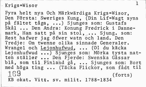 //// Krigs=Wisor * //// Fyra helt nya Och Märkwärdiga Krigs=Wisor, Den Första: Sweriges Kung, (Din Lif=Wagt syns på fältet tåga, ...) Sjunges som: Gustafs Skål ... Den Andra: Konung Fredrick i Dannemark, Han satt på sin stol, ... Sjung, som: Rest hafwer jag öfwer watn och land. Den Tredje: Om twenne olika sinnade Generaler. Wrangel och Lejonhufwud, ... (0! du käcka Lejonhufwud ...) Sjunges som: Mörka tysta natten ställer ... Den Fjerde: Swenska Gåssar blå, som til Finland gå, ... Sjunges som: Bort med höga ting ... (Täcka Flickor, som fådt til //// 516 > (forts) //// KB okat. Vitt. sv. milit. 1788-1834 ////