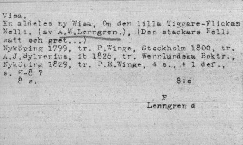 //// Visa. //// En aldeles r.y Wisa, Om den lilla Tiggare-Flickan Noll i. (av A»K .Le nr gr en .). (Pen stackars E«Ui satt oeh gre-rrrr^--- //// Nyköping 1799, tr. P.'A'inge, Stockholm 1800, tr. A.J.äyiy.eniv;*, it 1?26, tr. Wénnlurdska Eoktr., Nyköving 1*29, tr. P.K.Vinge, 4 a., + 1 def., a. r-8 ? //// P f. 8; g //// F //// Lenngren a ////