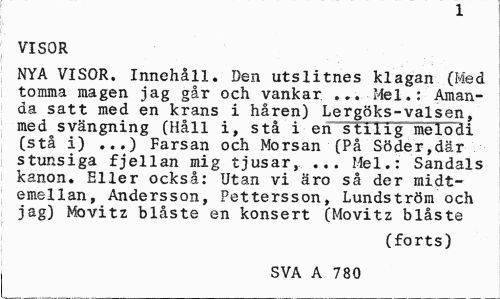 //// X //// VISOR //// NYA VISOR. Innehåll. Den utslitnes klagan (Med tomma magen jag går och vankar ... Mel.: Amanda satt med en krans i håren) Lergöks-valsen, med svängning (Håll i, stå i en™"stilig melodi (stå i) ...) Farsan och Morsan (På Söder,där stunsiga fjellan mig tjusar, ... Mel.: Sandals kanon. Eller också: Utan vi äro så der midt-emellan, Andersson, Pettersson, Lundström och jag) Movitz blåste en konsert (Movitz blåste //// (forts) //// SVA A 780 ////
