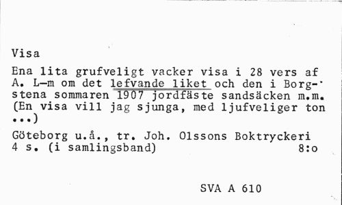 //// Visa //// Ena lita grufveligt vacker visa i 28 vers af A. L—m om det lefvande liket och den i Borg-* stena sommaren 1907 jordfäste sandsäcken m.m. (En visa vill jag sjunga, med ljufveliger ton //// Göteborg u.å., tr. Joh. Olssons Boktryckeri 4 s. (i samlingsband) 8:o //// SVA A 610 ////