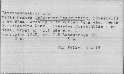 //// Levernesbesk rivning ' //// Matts Krakes Lefwerne s-beskrifni **. föreställd i en Wisa, Är? slIfT"? en"*ruTterfTo j a etc, .T em te Finkelst rems öden; likaledes föreställde i en Wisa. Grymt är ?ritt ode etc, . . „ Jönköping 132?, tr. .T.P.Lundströms Tr. 8 ' s . Po //// UUB Folkv. 6 a 19 ////