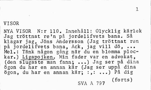 //// 1 //// Jim //// VISOR //// NYA VISOR N:r 110. Innehåll: Olycklig kärlek Jag tröttnat re'n på jordelifvets bana. Så klagar jag, Jöns Andersson (Jag tröttnat ren på jordelifvets bana, Ack, jag vill dö, ... Mel.: Tänk någon gång när du en blomma plockar.) Ligapojken. Min fader var en advokat, (den slugaste man fann; ...) Jag ser på dina ögon du har en annan kär (Jag ser uppå dina ögon, du har en annan kär; :,: ...) På dig //// (forts) //// SVA A 797 ////