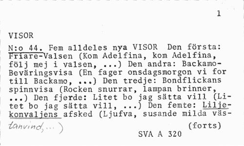 //// 1 //// VISOR //// N:o 44. Fem alldeles nya VISOR Den första: Friare-Valsen (Kom Adelfina, kom Adelfina, följ mej i valsen, ...) Den andra: Backamo-Beväringsvisa (En fager onsdagsmorgon vi for till Backamo, ...) Den tredje: Bondflickans spinnvisa (Rocken snurrar, lampan brinner, ...) Den fjerde: Litet bo jag sätta vill (Litet bo jag sätta vill, ...) Den femte: Lilje-konvaliens afsked (Ljufva, susande milda väs- //// (forts) //// SVA A 320 ////