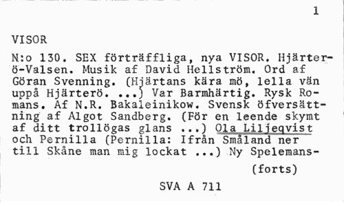 //// 1 //// VISOR //// N.:o 130. SEX förträffliga, nya VISOR. Hjärter-ö-Valsen. Musik af David Hellström. Ord af Göran Svenning. (Hiärtans kära mö, lella vän uppå Hjärterö. ...5 Var Barmhärtig. Rysk Romans. Af N.R. Bakaleinikow. Svensk öfversätt-ning af Algot Sandberg. (För en leende skymt af ditt trollögas glans ...) Ola Liljeqvist och Pernilla (Pernilla: Ifrån Småland ner till Skåne man mig lockat ...) Ny Spelemans- //// (forts) //// SVA A 711 ////