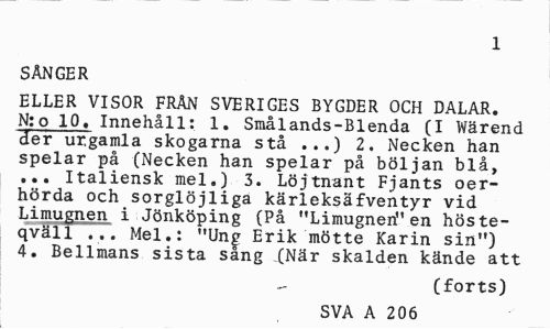 //// 1 //// SÅNGER //// ELLER VISOR FRÄN SVERIGES BYGDER OCH DALAR. N:o 10. Innehåll: 1. Smålands-Blenda (I Wärend Her" urgamla skogarna stå ...) 2. Necken han spelar på (Necken han spelar på böljan blå, ... Italiensk mel.) 3. Löjtnant Fjants oerhörda och sorglöjliga kärleksäfventyr vid Limugnen i Jönköping (På "Limugnen" en höste-qväll 77. Mel.: "Ung Erik mötte Karin sin") 4. Bellmans sista sång (När skalden kände att //// (forts) //// SVA A 206 ////