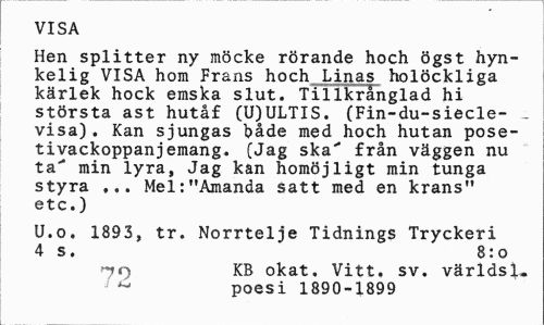//// VISA //// Hen splitter ny möcke rörande hoch ögst hyn-kelig VISA hom Frans hoch Linas holöckliga kärlek hock emska slut. Tillkrånglad hi största ast hutåf (U)ULTIS. (Fin-du-siecle- _ visa). Kan sjungas både med hoch hutan pose-tivackoppanjemang. (Jag ska"* från väggen nu ta^ min lyra, Jag kan homöjligt min tunga styra ... Mel:"Amanda satt med en krans" etc.) //// U.o. 1893, tr. Norrtelje Tidnings Tryckeri 4 s. 8:0 //// »79 KB okat. Vitt. sv. världs 1. //// J poesi 1890-1899 ////
