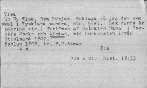 //// Vi sa //// Kr % Wisa, Som börjas: Beklaga må jag de™ som skal i Tyskland wandra, etc. ("tel,. Sex runda år tnkriivr etc.) Skrifwen af Soldaten Hana i Gag-räfs Sockr- och Lindan, wid' hemkomsten ifrån St ralsund //// Fahlun ifiOB, tr. P.C.Axmar //// 4 s. 8:0 //// UUE Z Utv. hist. 12:33 ////