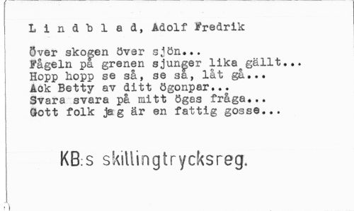 //// Lindblad, Adolf Fredrik //// över skogen över sjön... //// Fågeln pa grenen sjunger likställt... //// Hopp hopp se så, se sa, låt gå... //// Aok Betty av ditt ögonpar... //// Svara svara på mitt ögas fråga... //// Öott folk ja g är en fattig gosse... //// KB:S skillingtrycksreg. //// , i ////