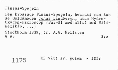 //// Finans=Spegeln //// Den krossade Finans=Spegeln, hwaruti man kan se Guldsmeden Jonas Lindberghf utan Hydro-Oxygen-Microscop (Farxväl med allt! med Silf-werskåp, ...) //// Stockholm 1839, tr. A.G. Hellsten 8 s. 8:0 //// | ^^ KB Vitt sv. polem - 1339 ////