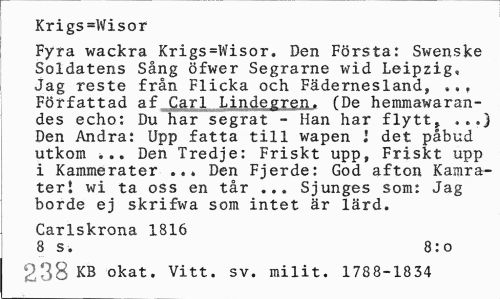 //// Krigs=Wisor //// Fyra wackra Krigs=Wisor. Den Första: Swenske Soldatens Sång öfwer Segrarne wid Leipzig, Jag reste från Flicka och Fädernesland, . ,t Författad af Cg.rl Lindegren. (De hemmawaran-des echo: Du har segrat - Han har flytt, . ..) Den Andra: Upp fatta till wapen l det påbud utkom i.. Den Tredje: Friskt upp, Friskt upp i Kammerater Den Fjerde: God afton Kamrater! wi ta oss en tår ... Sjunges som: Jag borde ej skrifwa som intet är lärd. //// Carlskrona 1816 //// 8 s. 8:0 //// 238 KB okat. Vitt. sv. milit. 1788-1834 ////