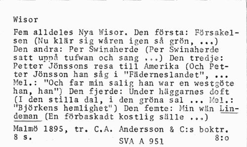 //// Wisor //// Fem alldeles Nya Wisor, Den första: Försakelsen (Nu klär sig wåren igen så grön, ,,,) Den andra: Per Swinaherde (Per Svinaherde satt uppå tufwan och sang ,,,) Den tredje: Petter Jönssons resa till Amerika (Och Petter Jönsson han såg i "Fäderneslandet", ... Mel.: "Och far min salig han x^ar en westgöte han, han") Den fjerde: Under häggarnes doft (I den stilla dal, i den gröna sal ... Mel.: "Björkens hemlighet") Den femte: Min wän Lindeman (En förbaskadt kostlig sälle //// Malmö 1895, tr. C.A. Andersson & C:s boktr. //// 8 s* SVA A 951 8:0 ////