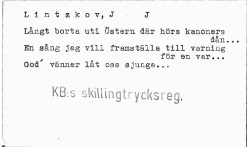 //// Lintzkov, J J //// Långt borta uti östern där hörs kanoners //// dån... //// En sång jag vill framställa till varning //// för en var,.. God' vänner låt oss sjunga... //// KB.s skillingtrycksreg, ////