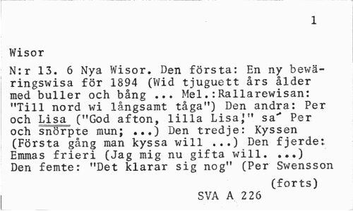 //// 1 //// Wisor //// N:r 13. 6 Nya Wisor. Den första: En ny bewä-ringswisa för 1894 (Wid tjuguett års ålder med buller och bång ... Mel.:Rallarewisan: "Till nord wi långsamt tåga") Den andra: Per och Lisa ("God afton, lilla Lisa,"' sa" Per och snörpte mun; ...) Den tredje: Kyssen (Första gång man kyssa v/ill ...) Den fjerdet Emmas frieri (Jag mig nu gifta will. ...) Den femte: "Det klarar sig nog" (Per Swensson //// (forts) //// SVA A 226 ////