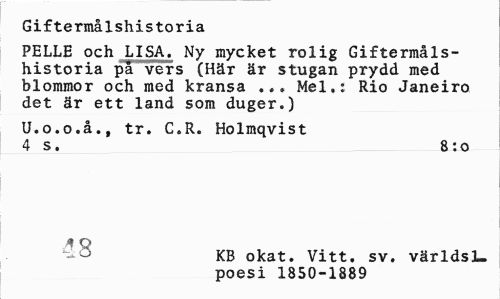 //// Giftermålshistoria //// PELLE och LISA. Ny mycket rolig Giftermålshistoria på vers (Här är stugan prydd med blommor och med kransa ... Mel.: Rio Janeiro det är ett land som duger.) //// U.o.o.å., tr. C.R. Holmqvist 4 s. 8:0 //// 3 KB okat. Vitt. sv. världsL. //// poesi 1850-1889 ////