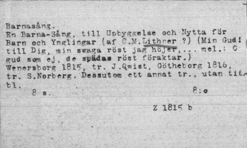 //// Barnasång. //// En Barna-3å.ng, till öpbyggelse och Nytta for Barn och Ynglingar (af C.M,Lithrer ?} (Min Gu<U till Dig, -nin svaga rost ^AfT^ojTf, .. . mel.; C gud san ej, de smädas röst föraktar.) Wenershorg .1815, tr. J.^wist, Götheborg 1816, tr. S.Norberg, Dessutom ett annat tr. , utan tit. //// 8 s. 8;o //// Z 181* b ////