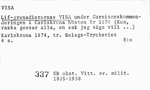 //// VISA //// Lif-grenadierernas^VISA under Garnisonskommen-deringen i Carlskrona hösten år 18 74 (Kom, raska gossar alla, en sak jag säga vill . .„) //// Karlskrona 1874, tr. Bolags-Tryckeriet 4 s. 8:o //// 337 KB okat. Vitt. sv, milit. //// 1835-1958 ////