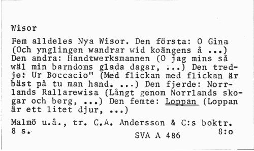 //// Wisor //// Fem alldeles Nya Wisor, Den första: 0 Gina (Och ynglingen wandrar wid koängens å ...) Den andra: Handtwerksmannen (0 jag mins så wäl min barndoms glada dagar, ...) Den tredje: Ur Boccacio" (Med flickan med flickan är bäst pa tu man hand* •••) Den fjerde: Norrlands Rallarewisa (Långt genom Norrlands skogar och berg, ...) Den femte: T.nrman (Loppan är ett litet djur, ..,) //// Malmö u.å,, tr. C.A. Andersson & C:s boktr. 8 S* SVA A 486 8:0 ////
