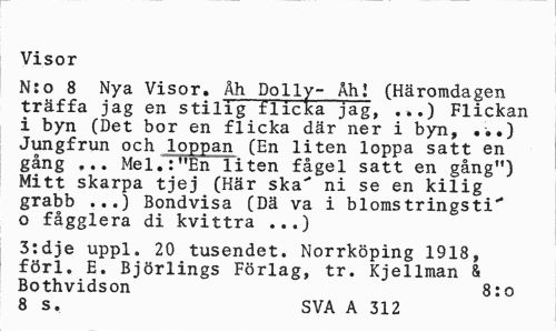 //// Wisor //// N:o 8 Nya Visor. Åh Dolly- Åhl (Häromdagen träffa jag en stilig flicka jag, .».) Flickan i byn (Det bor en flicka där ner i byn, •••) Jungfrun och loppan (En liten loppa satt en gång ... Mel.:"En liten fågel satt en gång") Mitt skarpa tjej (Här ska' ni se en kilig grabb ...) Bondvisa (Dä va i blomstringsti" o fågglera di kvittra ...) //// 3:dje uppl. 20 tusendet. Norrköping 1918, förl. E. Björlings Förlag, tr. Kjellman & Bothvidson 8:o //// 8 s. SVA A 312 ////