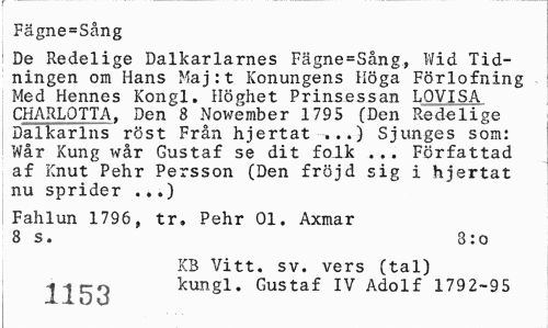 //// Fägne=Sång //// De Redelige Dalkarlarnes Fägne=Sång, Wid Tidningen om Hans Maj:t Konungens Höga Förlofning Med Hennes Kongl. Höghet Prinsessan LOVISA CHARLOTTA, Den 8 Nowember 179 5 (Den Redelige Dalkarins röst Från hjertat ...) Sjunges som: Wår Kung wår Gustaf se dit folk ... Författad af Knut Pehr Persson (Den fröjd sig i hjertat nu sprider ...) //// Fahlun 1796, tr. Pehr 01. Axmar 8 s. 3:o //// KB Vitt. sv. vers (tal) 1J. 53 kungl. Gustaf IV Adolf 1792-95 ////