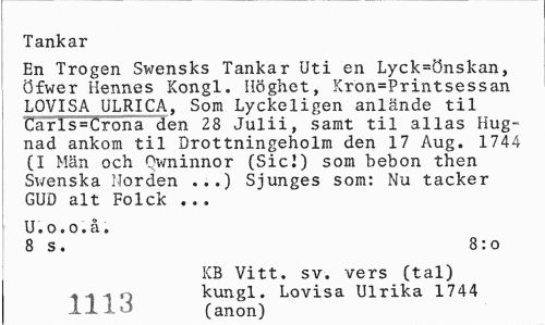 //// Tankar //// En Trogen Swensks Tankar Uti en Lyck=önskan, öfwer Hennes Kongl. Höghet, Kron=Printsessan LOVISA ULRICA, Som Lyckeligen anlände til Carls=Crona den 28 Julii, samt til allas Hugnad ankom til Drottningeholm den 17 Aug. 1744 (I Män och Qwninnor (Sicl) som bebon then Swenska Horden ...) Sjunges som: Nu täcker GUD alt Folck ... //// U. o. o. å. //// 8 s. 8:o //// KB Vitt. sv. vers (tal) ,,, ; kungl. Lovisa Ulrika 1744 //// Hj (anon) ////