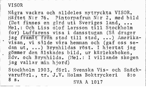 //// VISOR //// Några vackra och alldeles nytryckta VISOR. Häftet N:r 76. Pintorpafrun N:r 2, med bild (Det finnes en gård uti Sveriges land, ... Mel.: Och Liss olof Larsson till Stockholm for) Luffarens visa i dansstugan (Så drager jag framåt från stad till stad, ...) Amerikavisan, vi sålde våra hemman och (gaf oss sedan ut, ...) Brynhildas röst. I hjertat jag gömmer den älskades bild, ur kärleksboken, Edv. och Brynhilda. (Mel.: I villande skogen jag vallar min hjord) //// Stockholm 1903, förl. Svenska Vis- och Snäck-varuförl., tr. J.V. Holms Boktryckeri 8:o //// 8 SVA A 1017 ////