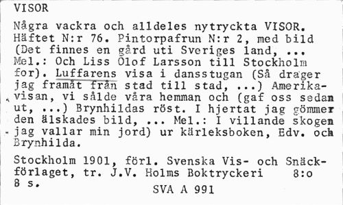 //// V1 SUR //// Några vackra och alldeles nytryckta VISOR. Häftet N:r 76. Pintorpafrun N:r 2, med bild (Det finnes en gård uti Sveriges land, ... Mel.: Och Liss Olof Larsson till Stockholm for). Luffarens visa i dansstugan (Så drager jag framåt frän stad till stad, ...) Amerika-svisan, vi sålde våra hemman och (gaf oss sedan ut, ...) Brynhildas röst. I hjertat jag gömmer den älskades bild, ... Mel.: I villande skogen » jag vallar min jord) ur kärleksboken, Edv. och Brynhilda. //// Stockholm 1901, förl. Svenska Vis- och Snäck-förlaget, tr. J.V. Holms Boktryckeri 8:o //// 8 s# SVA A 991 ////