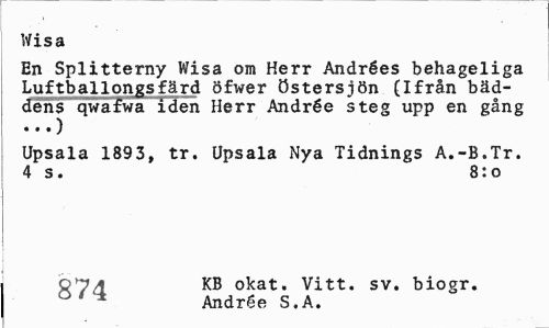 //// Wisa //// En Splitterny Wisa om Herr Andrées behageliga Luftballongsfärd öfwer Östersjön (Ifrån bäddens qwafwa iden Herr Andrée steg upp en gång //// Upsala 1893, tr. Upsala Nya Tidnings A.-B.Tr. 4 s. 8:0 //// 07a KB okat. Vitt. sv. biogr. //// 0' * Andrée S.A. ////