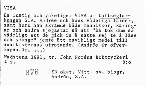 //// VISA //// Bil lustig och ynkeliger VISA om Luftseglar-kungen S.A. Andrée och hans vådeliga färder, samt huru han skrämde både menniskor, käringar och andra sjögastar så att "Dä tok dum så vådeligt att de gick in å satte sej te å läse och sjunge" jemte Ett osvikligt medel till anarkisternas utrotande. (Andrée är öfver-ingeniör, //// Wadstena 1891, tr. John Noréns Boktryckeri 4 s. 8:0 //// g76 KB okat. Vitt. sv, biogr. Andrée, S.A. ////