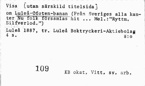 //// Visa [utan särskild titelsida] //// om Luleå-Ofoten-banan (Från Sveriges alla kanter Nu folk församlas hit ... Mel.:"Ryttm. Silfverlod.") //// Luleå 1887, tr. Luleå Boktryckeri-Aktiebolag //// 4 s. 8:0 //// i //// 1 09 //// KB okat, Vitt, sv. arb, ////
