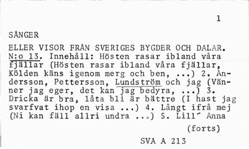 //// 1 //// SÅNGER //// ELLER VISOR FRÅN SVERIGES BYGDER OCH DALAR. N:o 13. Innehåll: Hösten rasar ibland våra fjällar (Hösten rasar ibland våra fjällar, Kölden käns igenom merg och ben, ...) 2, Andersson, Pettersson, Lundström och jag (Vänner jag eger, det kan jag bedyra, ...) 3. Dricka är bra, låta bli är bättre (I hast jag svarfvat ihop en visa ...) 4. Långt ifrå mej (Ni kan fäll aliri undra .,<,) 5. Lill" Anna //// (forts) //// SVA A 213 ////