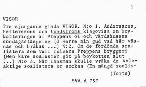 //// 1 //// VISOR //// Tre sjungande glada VISOR. N:o 1. Anderssons, Petterssons och Lundströms klagovisa om boy-kotteringen af Preppens öl och värdshusens söndagsstängning (0 Herre min gud vad här väsnas och bråkas ."„.) N:2. Om de fördömda soa-listera som vell ruinera Preppens bryggeri (Men käre soalester gör på boykotten slut ...) N:o 3. När länsman skulle vräka de svin-aktige soalistera ur sockna (En mängd soalis- //// (forts) //// SVA A 757 ////