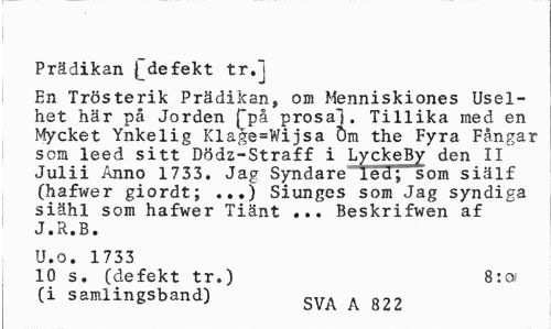 //// Prädikan ([defekt tr.J //// En Trösterik Prädikan, om Henniskiones Usel-net här på Jorden ["på prosal. Tillika med en Mycket Ynkelig Klage=Wijsa Öm the Fyra Fångar som leed sitt Dödz-Straff i LyckeBy den II Julii Anno 1733. Jag Syndare led;"som siälf (hafwer giordt; ...) Siunges som Jag syndiga siähl som hafwer Tiänt ... Beskrifwen af J. R. B * //// U.o. 1733 //// 10 s. (defekt tr.) 8:o? //// (i samlingsband) SVA A g22 ////