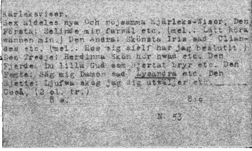 //// - v-.- ¦¦ - . . . „ ., - . ... , - % -; ,- . //// Sex aldel.es nya Och röj samma Kjärleks-Wisor, Den, Första: 3elj née min farväl etc. (mel,. Lätt hora wär.nen a in. ] Den. ~ndra; Skonsxa Iris *&,d Cl lan-, >äes etn; t^el*. So® *i*lf har jkfcg .")- //// .per, tredje: Herdinr-a Sjcär: har hw&d etc.. Den. Fi,«.rds.. Du lilla Gud. «ern- iijeriat Vryr etc. Den WmUi #ftg nig Das^on sad Lyaancra etc. Deh :>j ett eLjufna akvg jag dig ut**5j.er Eadi; U gl. tr.) //// • -.i» //// 'i'. SÖ? " ////